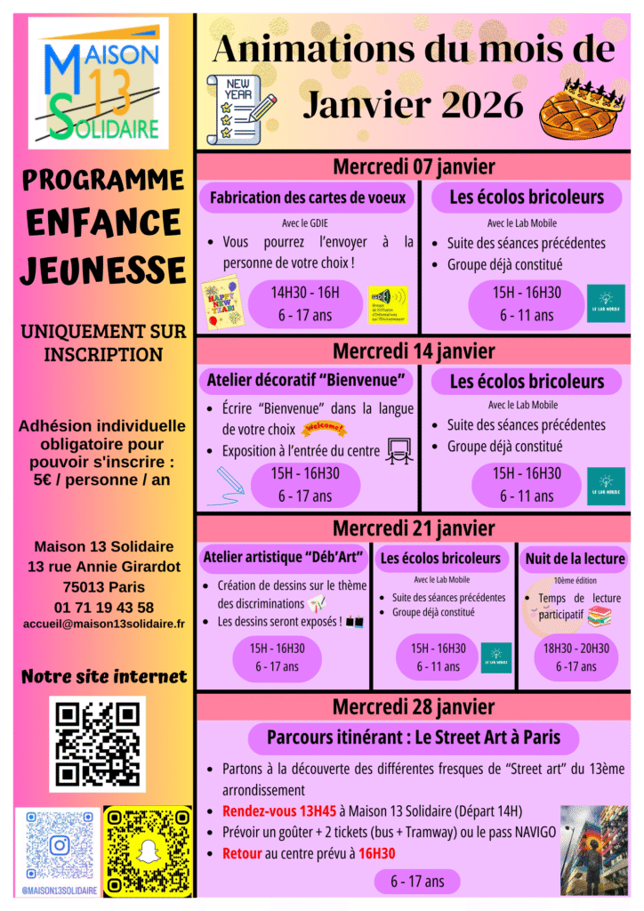 Vous pouvez inscrire vos enfants « à la carte » : ils peuvent participer à l’activité ou à plusieurs activités du programme dans la limite des places disponibles et selon la tranche d’âge indiquée.