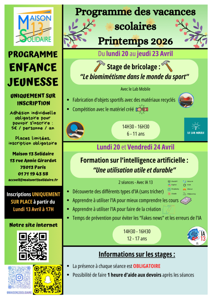 Durant les vacances scolaires, nous vous proposons plusieurs activités divers pour vos enfants et adolescents. Leur participation est SUR INSCRIPTIONS.