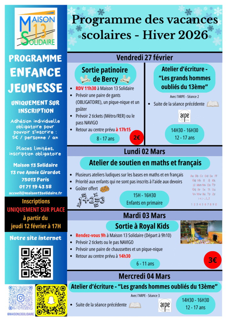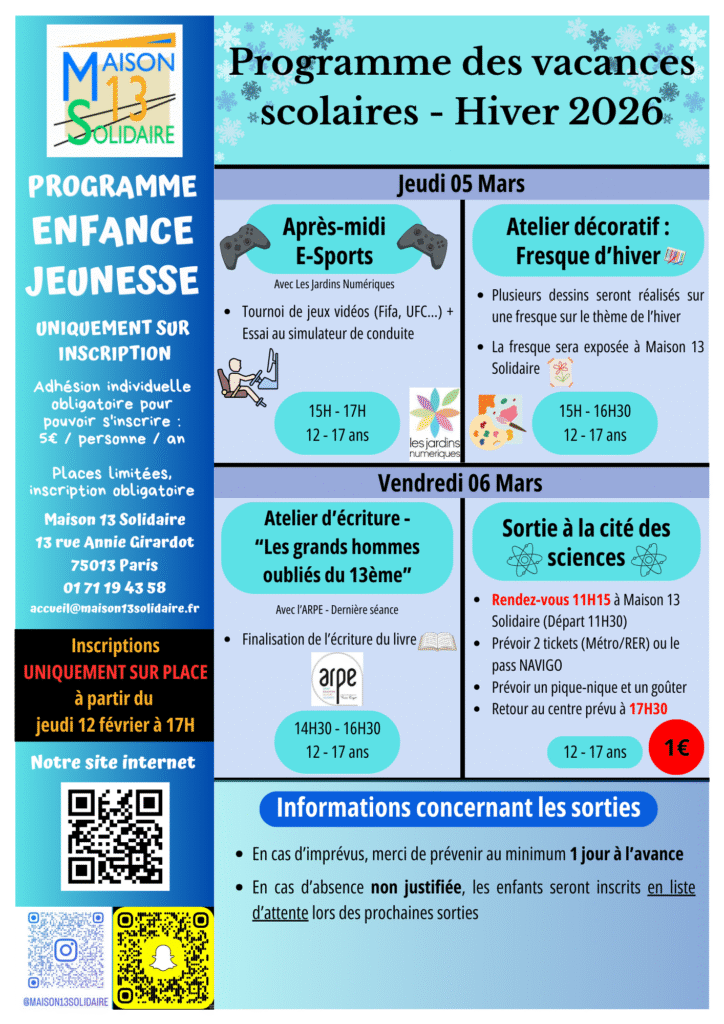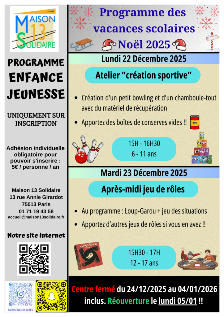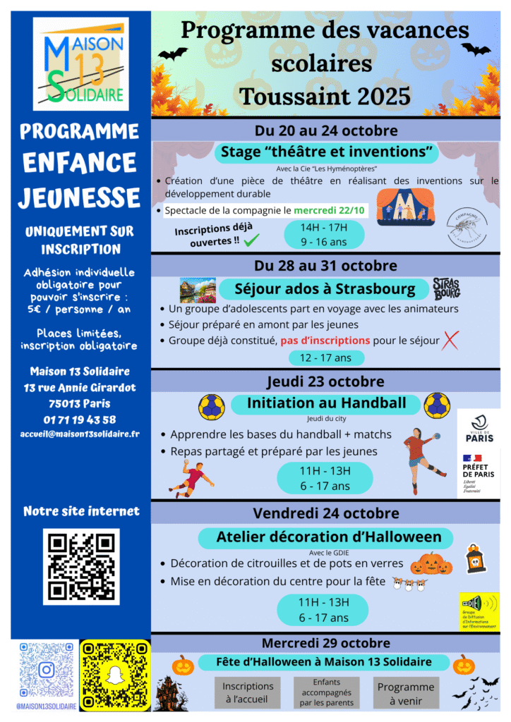 Toute l’année, des activités sont proposées pour vos enfants et adolescents durant les vacances scolaires. Retrouvez toute la programmation de l’année ci-dessous