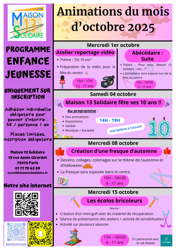 Programme mensuel des animations périscolaires Chaque mois, vous trouverez le programme mensuel des activités pour vos enfants et adolescents. Programme du mois d’Avril 2025 Pour télécharger le programme, cliquez ici : Programme du mois de Mai 2025 Pour télécharger le programme, cliquez ici : Programme du mois de Juin 2025 Pour télécharger le programme, cliquez ici : Programme du mois d’Octobre 2025 Téléchargez le programme en cliquant ici :