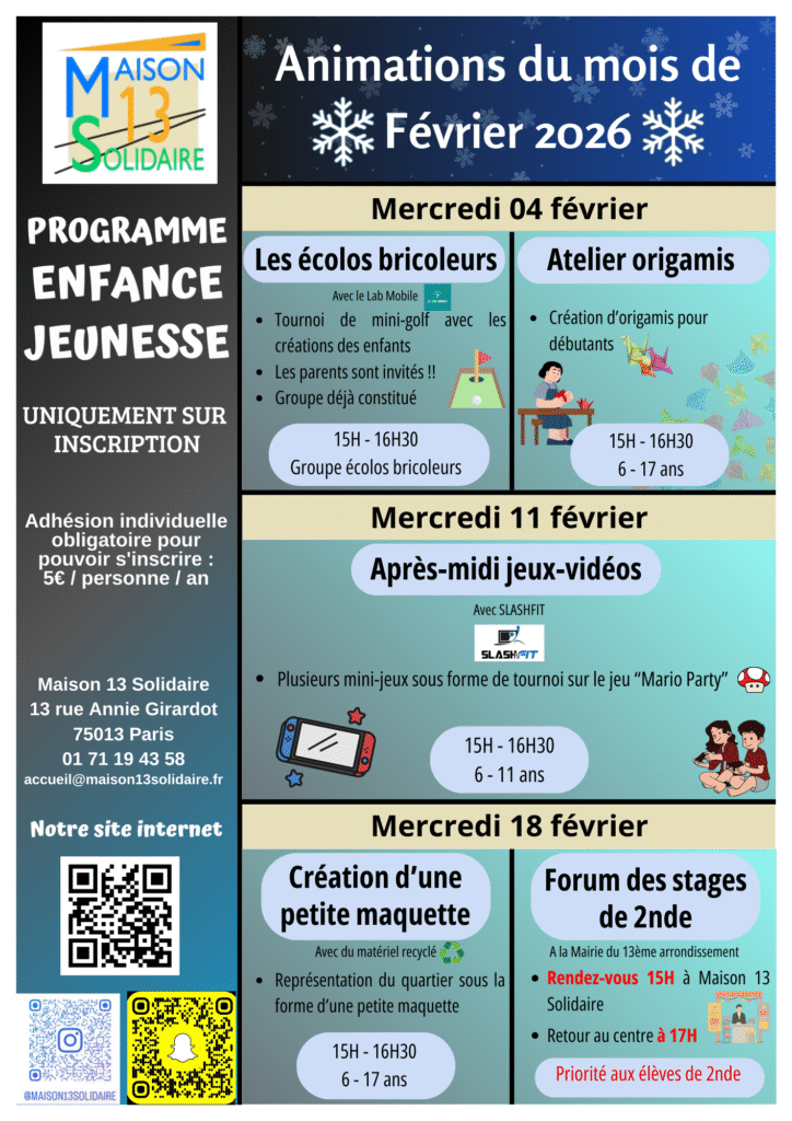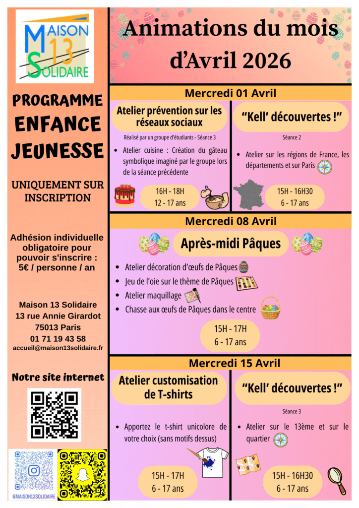 Programme mensuel des animations périscolaires Chaque mois, vous trouverez le programme mensuel des activités pour vos enfants et adolescents. Programme du mois de Janvier 2026 Téléchargez le programme en cliquant ici : Programme du mois de Février 2026 Téléchargez le programme en cliquant ici : Programme du mois de Mars 2026 Téléchargez le programme en cliquant ici : Programme du Mois d’Avril 2026 Téléchargez le programme en cliquant ici :